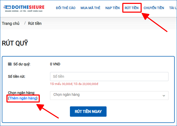 ♦ Đổi thẻ cào sang tiền mặt: Để rút tiền về tài khoản bạn cần cập nhật thông tin ngân hàng.