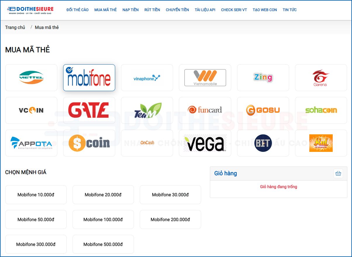 Sau khi thành công tại bước 2, tiền đã được chuyển vào tài khoản thì bạn cần truy cập vào mục “Mua mã thẻ”. Bạn có thể chọn một trong những loại thẻ điện thoại được bán trên Doithesieure.vn như: Mobifone, Vinaphone, Viettel, Vietnamobile. Hoặc nếu có nhu cầu đổi thẻ game sang tiền mặt cũng có đầy đủ Zing, Gate, Vcoin cho bạn lựa chọn. Tại mục mệnh giá phía dưới, chọn giá trị thẻ nạp phù hợp.