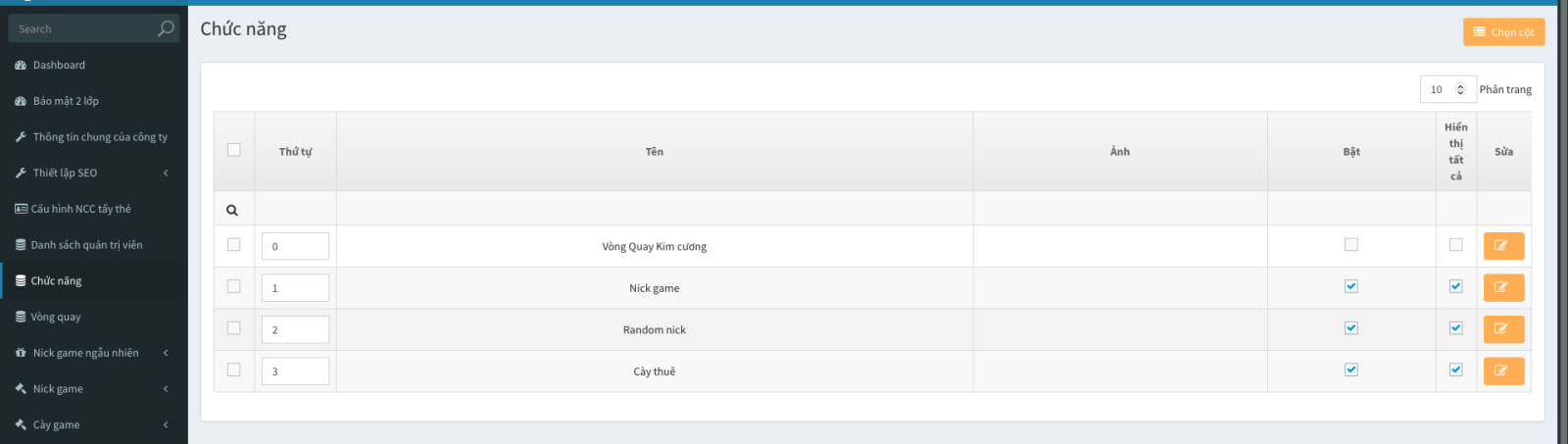 Các chức năng đều được bật/ tắt, Ẩn/ hiện ở phần quản lý của admin.